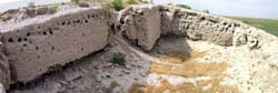 Другой въезд в цитадель вел с юга, из шахристана, уплощенной площадки, пpимыкающей к южной части цитадели. Наибольшая высота шахристана 7м., размеры основания 100х225м (2,25га). По периметру территория шахристана охвачена полукольцом крепостной стены. Остатки ее, в виде невысокого вала с ритмично расположенными возвышениями (руины башен) хорошо просматриваются на местности. В микротопографии шахристана читаются невысокие всхолмления - остатки жилых массивов, впадины площадей и улочек. Обширная площадь (40х80м) расположена между цитаделью и шахристаном у восточного въезда в шахристан. У северного въезда в шахристан небольшое понижение.