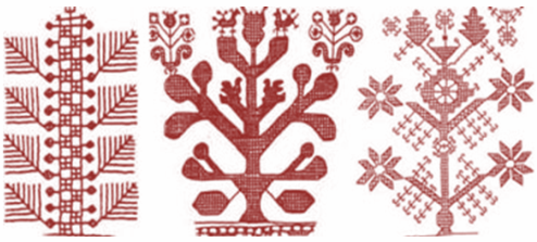Первый сюжет русской народной вышивки – дерево, оно – и древо, и древо мира, и древо познания, и модель мира. Мы говорим – корни памяти, корни истории, корни рода. Мы говорим – древо рода, родословное древо. Дерево участвует в нашей жизни не только служа нам жилищем, давая плоды, украшая наш дом. Дерево – не только лодка, тележка, игрушка, не только предметы быта и искусства. Дерево – это образ мира и образ мышления. Первый человек был собирателем корней и плодов, и дереву он обязан жизнью. Дерево – это и дом, и храм, и последнее пристанище человека. Дерево являло собой мироздание. Корни – это знак подземного мира, стволу соответствует земной мир, а кроне – небо.