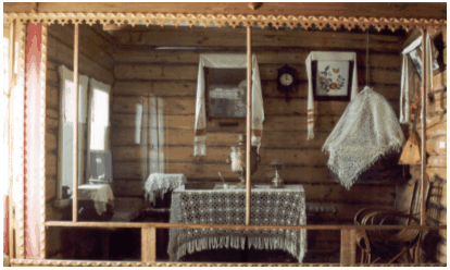 Особенностью интерьера жилища было преобладание неподвижной мебели, конструктивно связанной со срубом – это нары и скамьи (сак) вокруг стола и возле печки, перекладины (кашта), посудницы, полки (сентре). В переднем углу избы по диагонали от печи ставили стол, для сиденья использовали обрубки бревен, позднее стулья.