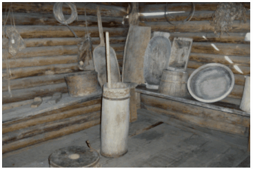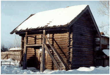 К избе примыкают надворные постройки: клеть для хранения зерна и имущества, лачуга (ла =) для пивоварения, приготовления и приема пищи, помещение для скота, хозяйственный сарай, погреб.